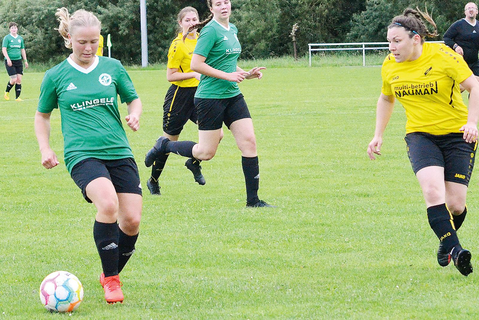 Kea Küpker (links, am Ball) war noch die auffälligste Offensivspielerin der SG Leer 04/Bingum beim Ligaauftakt gegen den TuS Eintracht Hinte. © Foto: Ammermann
