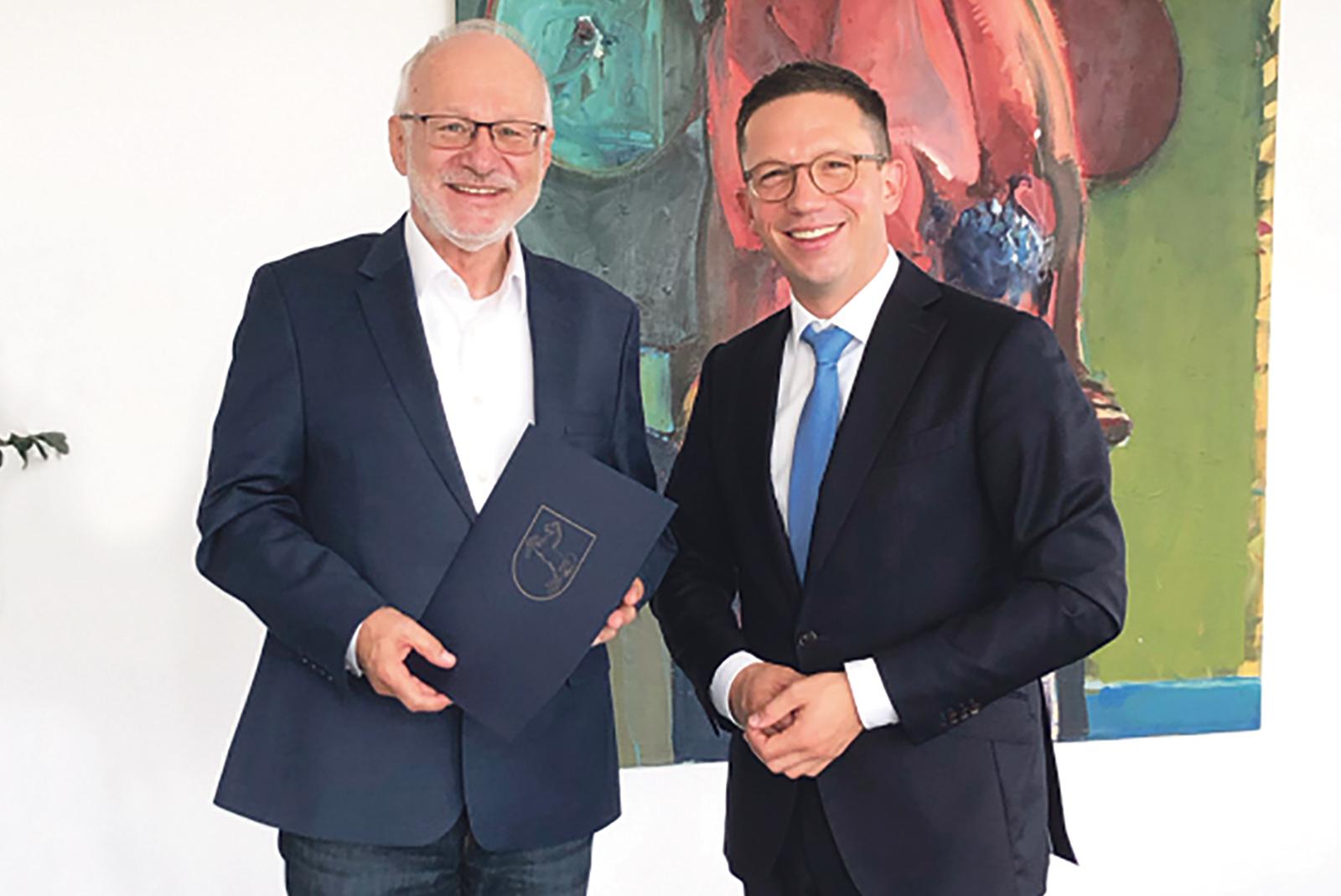 Die Ernennungsurkunde für seine dritte Amtszeit als Präsident der Hochschule Emden/Leer hat Prof. Dr. Gerhard Kreutz vom niedersächsischen Minister für Wissenschaft und Kultur Falko Mohrs erhalten.