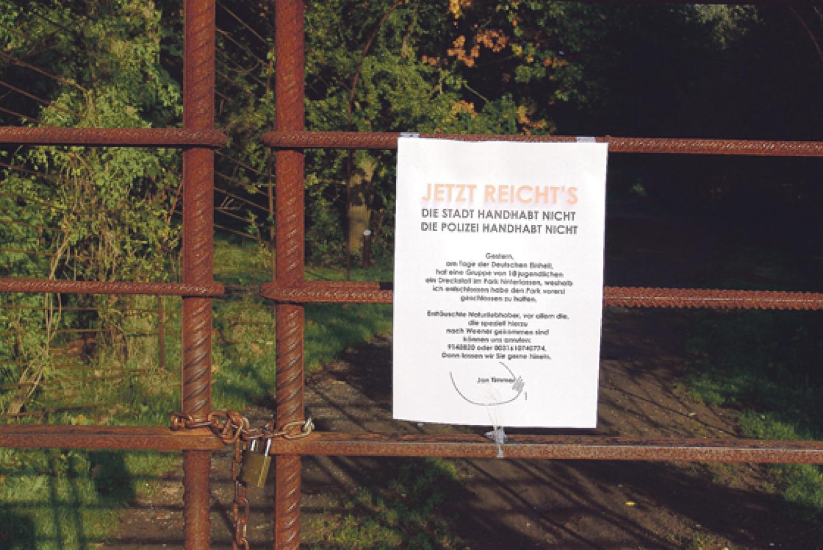 Ein weißer Zettel hängt am Eingangstor des Hesseparks: »Jetzt reicht´s. Die Stadt handhabt nicht, die Polizei handhabt nicht«. Parkeigentümer Jan Timmer und Elisabeth Tatenberg sind sauer und enttäuscht. Am Tag der Deutschen Einheit hat eine ...