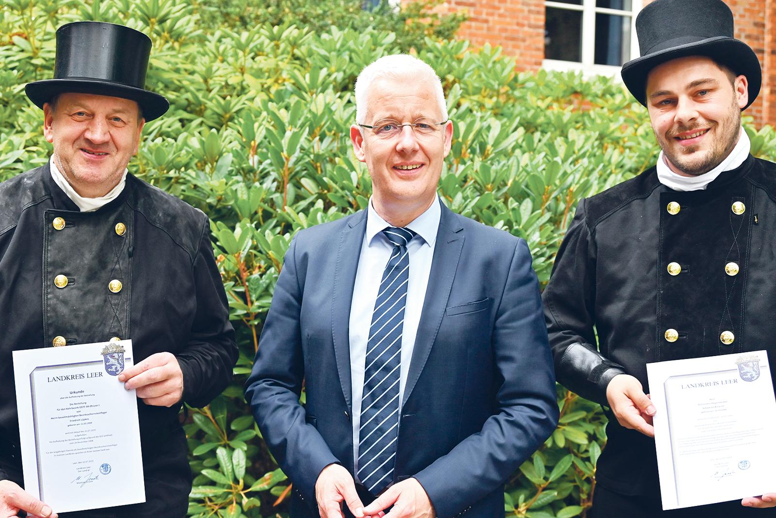 Sebastian Knierim (rechts) aus Rhauderfehn wurde jetzt von Landrat Matthias Groote als bevollmächtigter Bezirksschornsteinfegermeister für den Kehrbezirk Leer I verpflichtet. Er übernimmt damit das Amt von Friedrich Lüpkes (links) aus Nüttermoor, der sich als Schornsteinfeger in ...