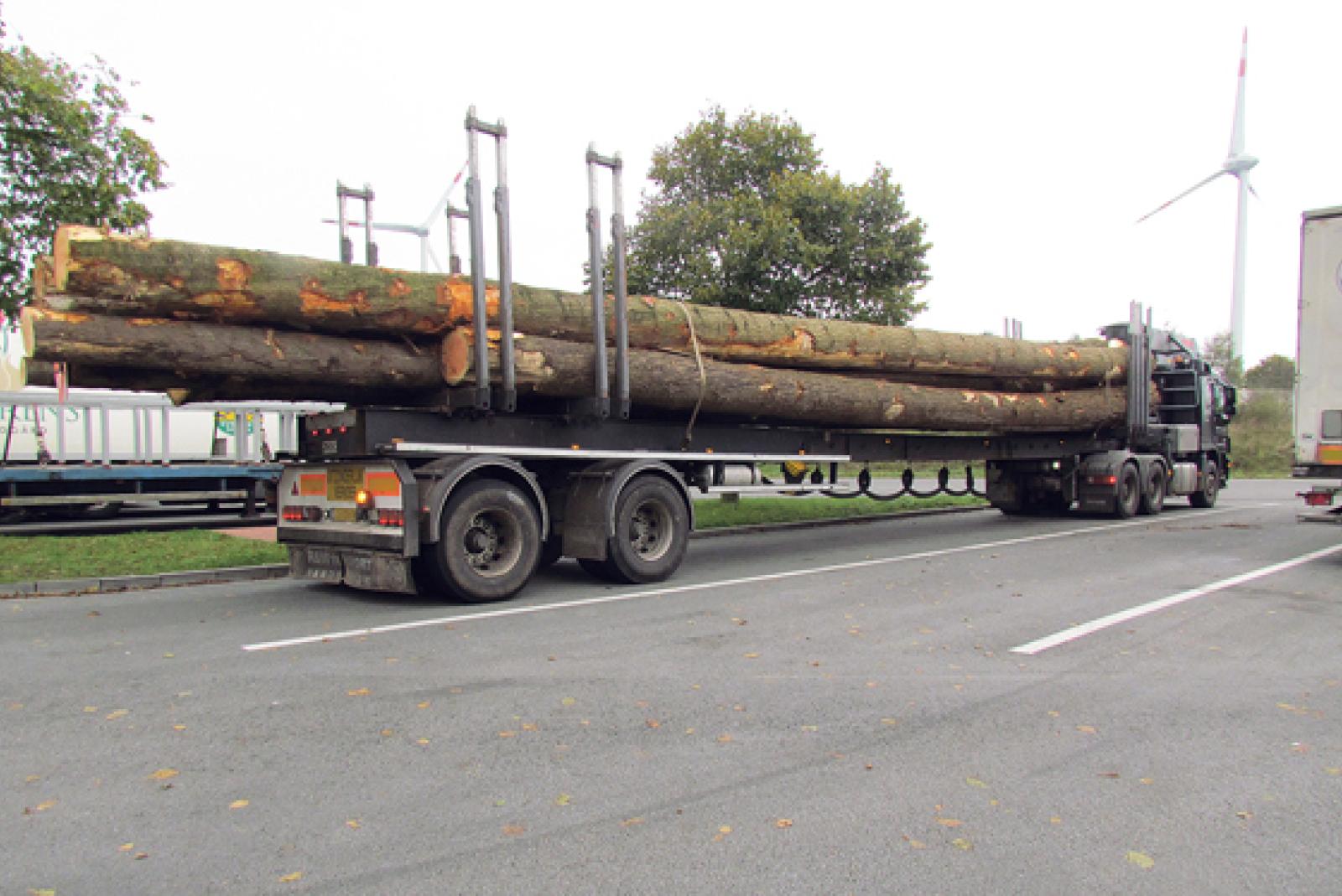 Laster mit Holzstämmen völlig überladen
