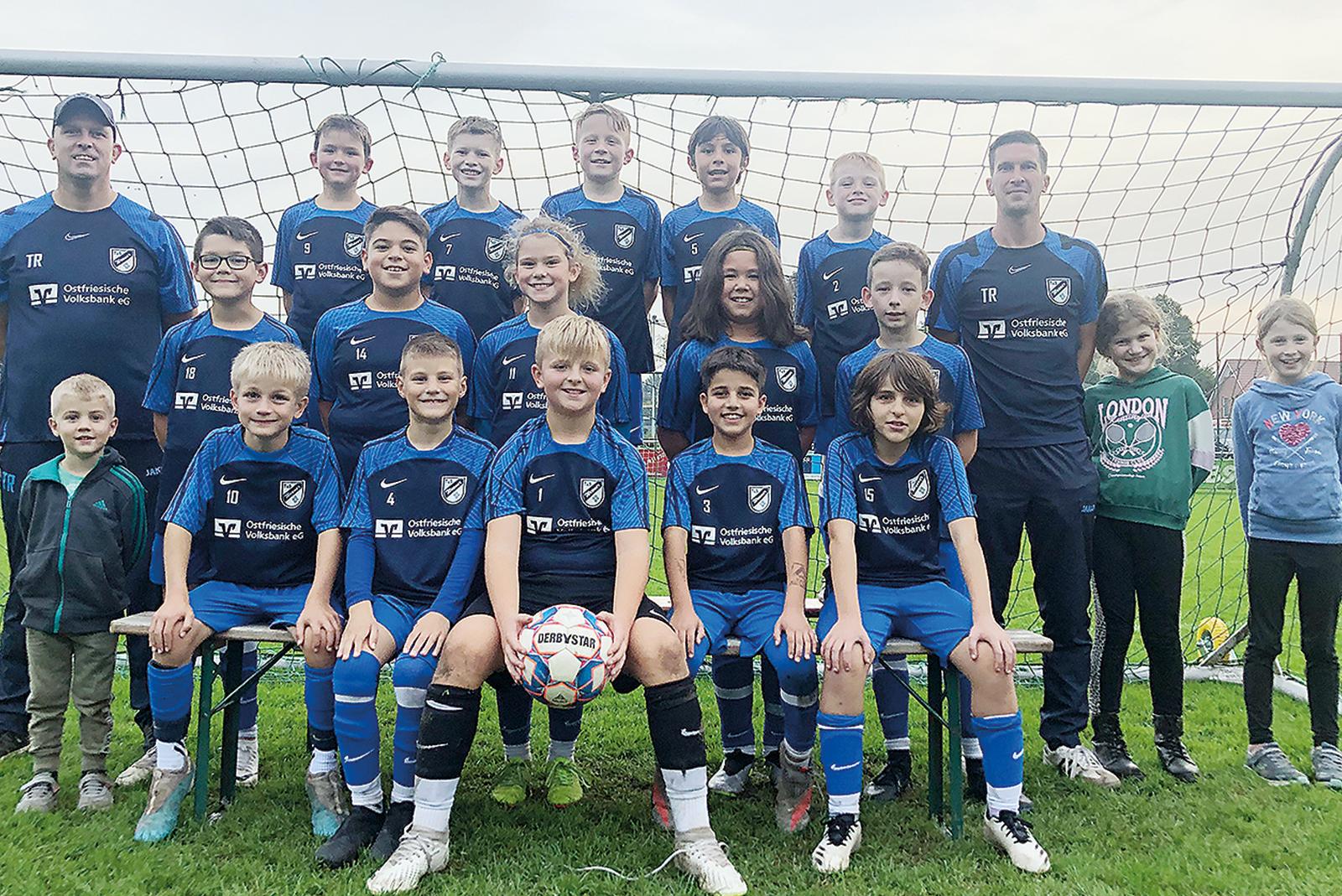 Die E-Jugend des TuS Weener hat aus mehreren Anlässen Grund zur Freude: Zum einem konnte die Mannschaft den vorzeitigen Aufstieg feiern. Zum anderen gab es neue Trainingsshirts.  © Foto: privat