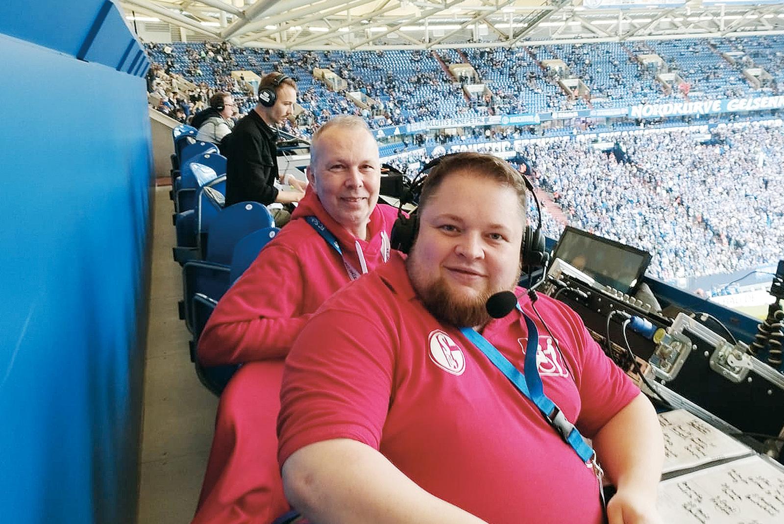 In für den FC Schalke 04 untypischem Rot - eine Signalfarbe, die Sehbehinderten hilft, die Blindenreporter besser zu erkennen - sitzen Benjamin Born (vorne) und sein Co-Reporter Andreas Spohn bei dem Spiel gegen Hertha BSC auf der Pressetribüne. © Foto: privat