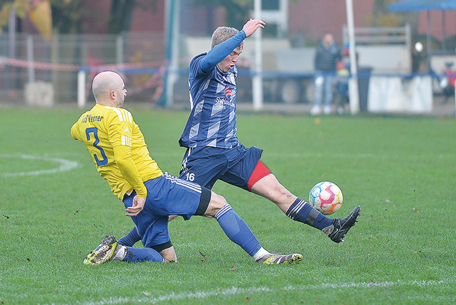 Torschützen im Zweikampf: Weeners Denis Ibraimi (links) stört hier Möhlenwarfs Pascal Frey bei der Ballverarbeitung. Beide erzielten jeweils ein Tor für ihr Team in der zweiten Hälfte. © Fotos: Born