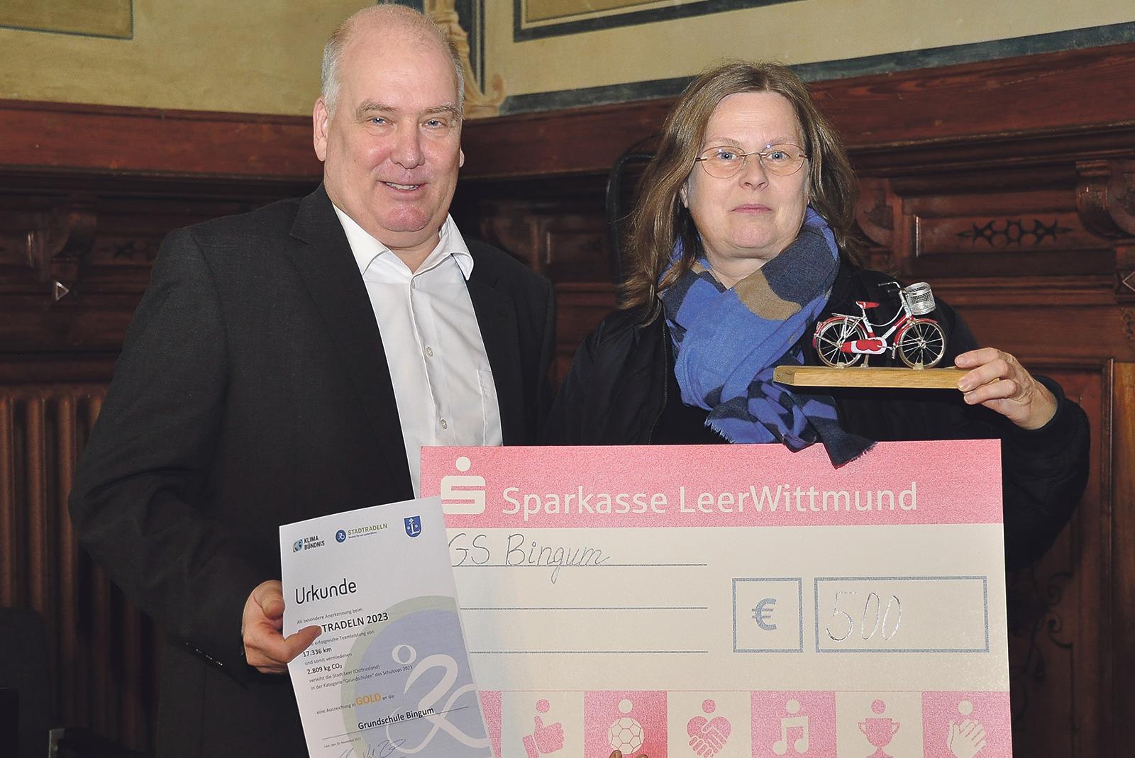 Die Stadt Leer hat sich am Montagabend gemeinsam mit Sponsoren für das große Engagement der Leeraner beim Stadtradeln im September bedankt. Im Rathausfestsaal wurden in verschiedenen Wertungen neben Schecks und Urkunden auch vier »Wanderpokale« in Form von Miniaturfahrrä...