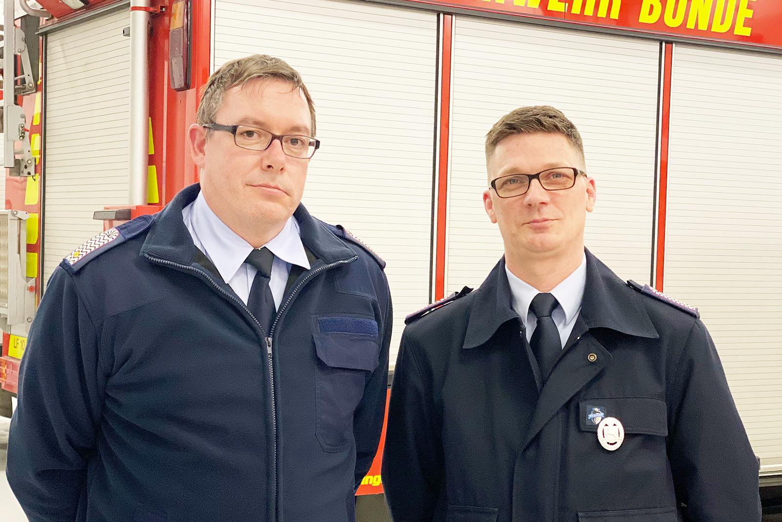 In geheimer Abstimmung wurden Ortsbrandmeister Hans-Hermann Leemhuis (links) und Dennis Iwanoff als sein Stellvertreter am Freitag für weitere sechs Jahre wiedergewählt. Für die beiden Führungskräfte ist es die dritte Amtsperiode ...