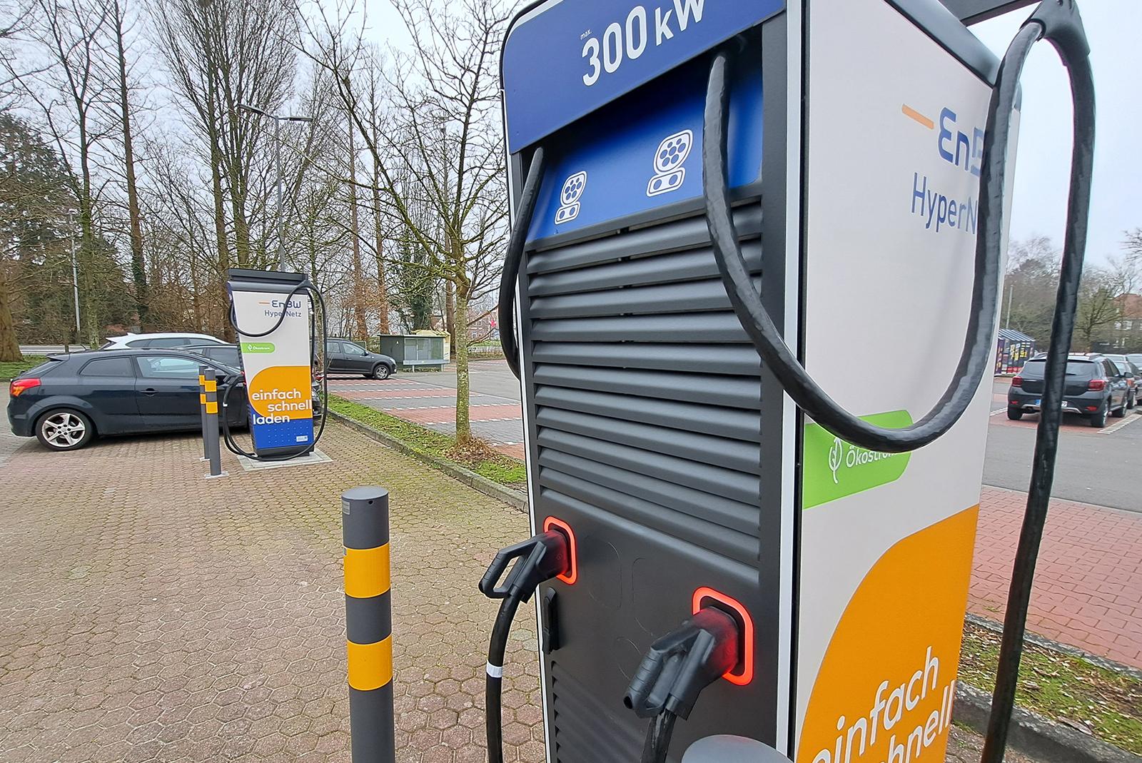 Auf dem Parkplatz des »Holz+Bau«-Marktes an der Neuen Feldstraße in Weener stehen jetzt zwei Schnellladesäulen für Elektro-Fahrzeuge mit Leistungsstärken von 300 beziehungsweise 150 Kilowatt (kW) zur Verfügung.