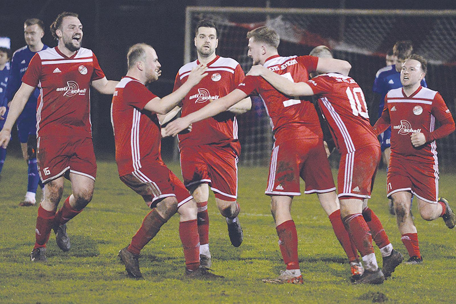 Der Jubel bei den Jemgumern war nach dem Treffer von Heiko Korporal (Dritter von rechts) groß. Anschließend brachten die Rheiderländer das Ergebnis mit viel Kampf über die Zeit.  © Foto: Born