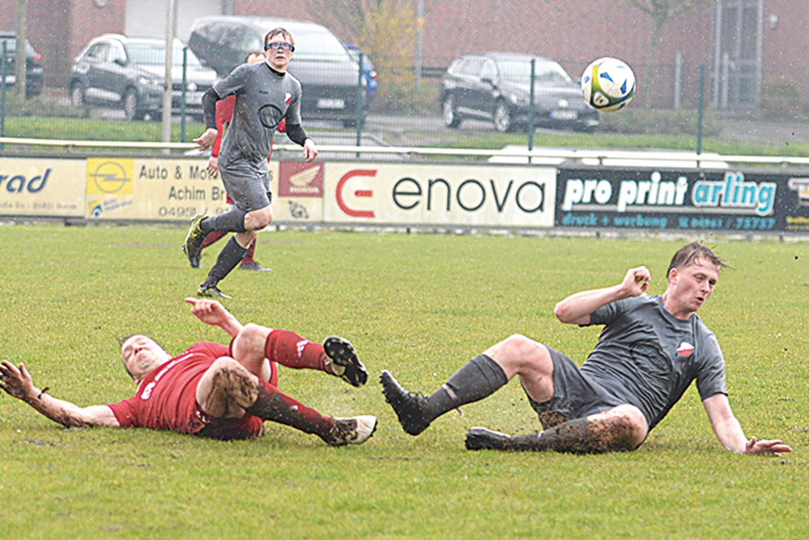 Sinnbildlich für die Partie: Sowohl Volker Wirtjes und der TV Bunde II (links) als auch Fortuna Veenhusen und Jannes Stock konnten fußballerisch auf rutschigem, tiefen Boden nicht glänzen.  © Foto: Born