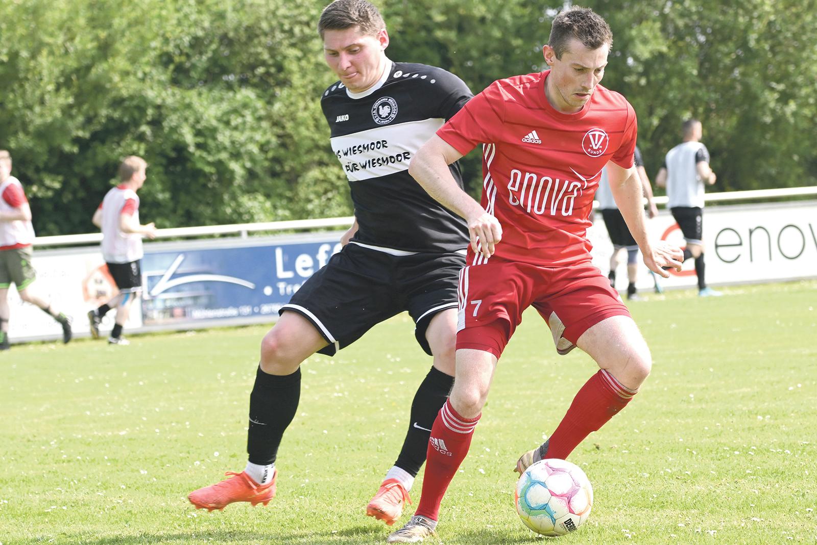 Bessere Zeiten: In der vergangenen Saison im Mai und im August in der aktuellen Spielzeit traten Waldemar Schott (links) und der VfB Germania beim TV Bunde an. Im Mai spielen Daniel Hoppen (rechts) im Ottermeer-Stadion in Wiesmoor wieder gegeneinander. © Foto: Bruins