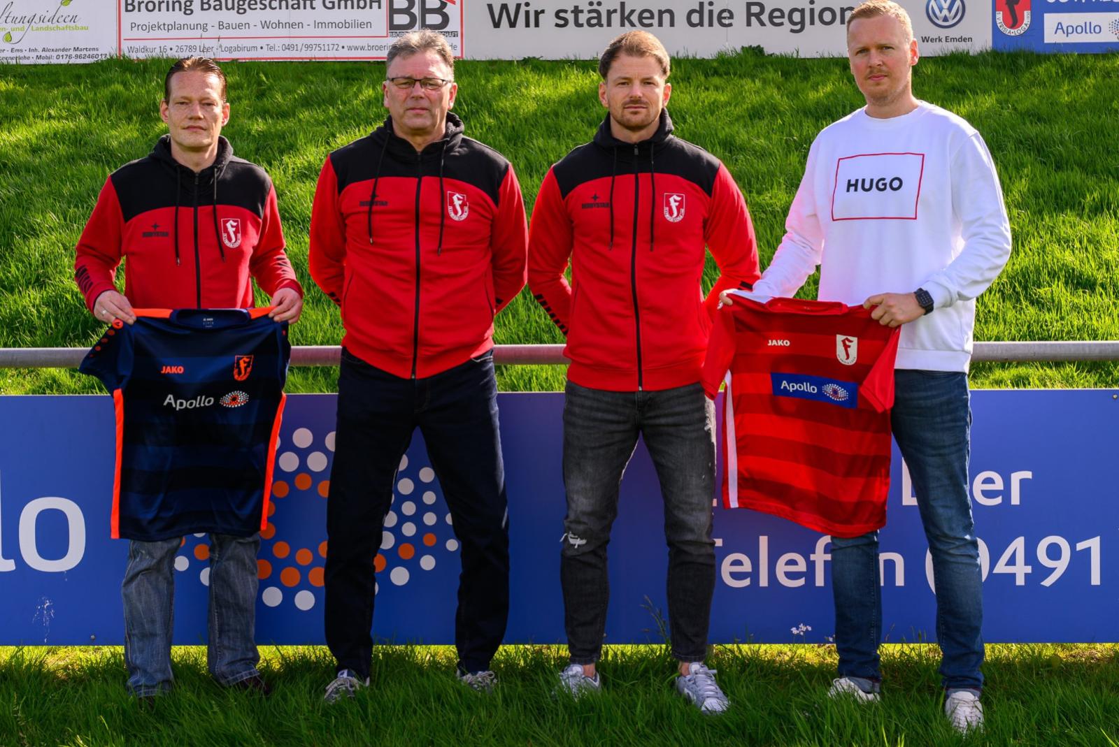 Timo Boekhoff, 1. Vorsitzender des SV Frisia Loga (rechts) präsentierte gemeinsam mit dem 2. Vorsitzenden Marco Lindemann (von links) Wilfried Böse als Co-Trainer und Kevin Böse als Trainer. © SV Frisia Loga