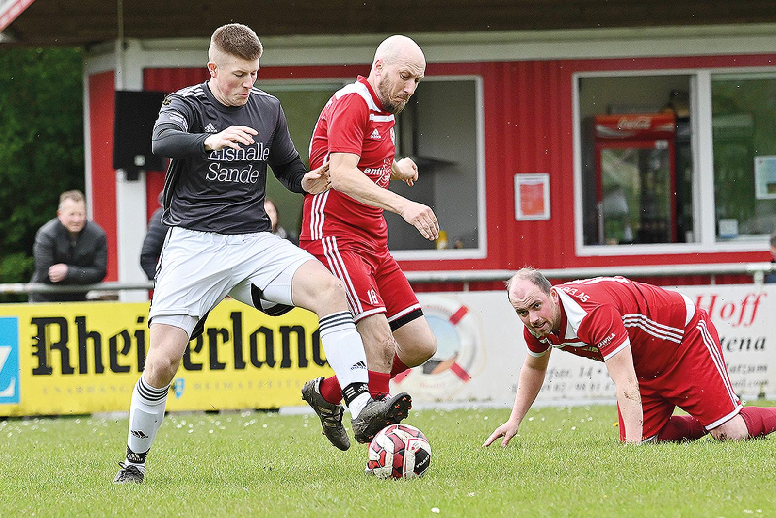 Vor allem im ersten Durchgang zeigten Klaas Tielemann (rotes Trikot, Mitte), Gerd Bekker und der SV Ems gegen den VfB Uplengen eine gute, kämpferische Leistung. © Foto: Bruins
