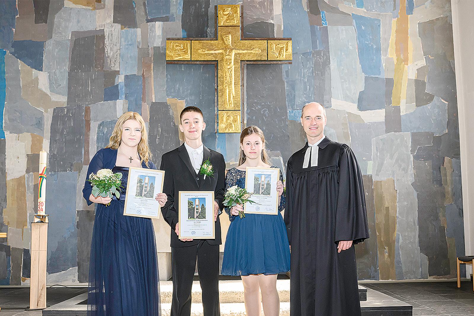 Drei Jugendliche wurden am Sonntag in der evangelisch-lutherischen Emmauskirche in Bunde konfirmiert. Im Bild von links Jolina Leuning, Luca Feldmann, Hannah Nanninga und Pastor Matthias Bokelmann. Hinter ihnen liegen zwei Jahre Konfirmanden-Zeit. Neben dem Konfirmandenunterricht, der alle zwei Wochen stattfand, ...