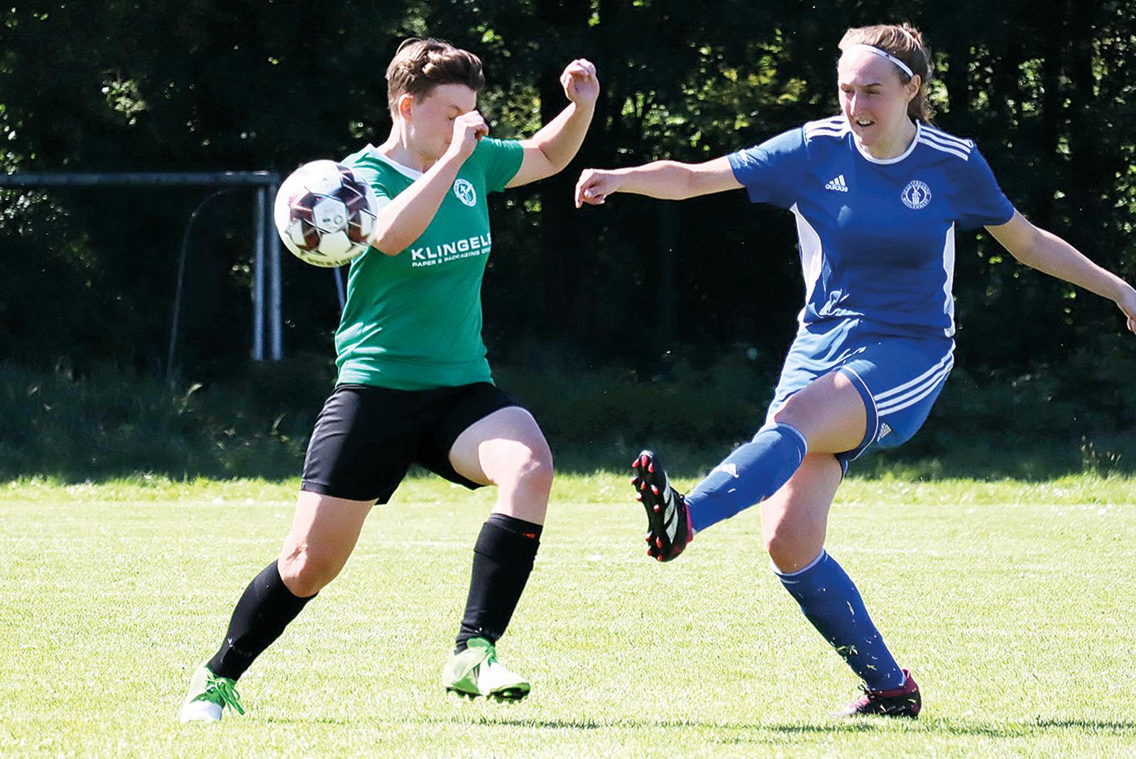 Aina Ibelings (links, SG Leer 04/Bingum) und auch Möhlenwarfs Deike Engberts konnten nicht zu Toren beitragen. © Foto: Ammermann