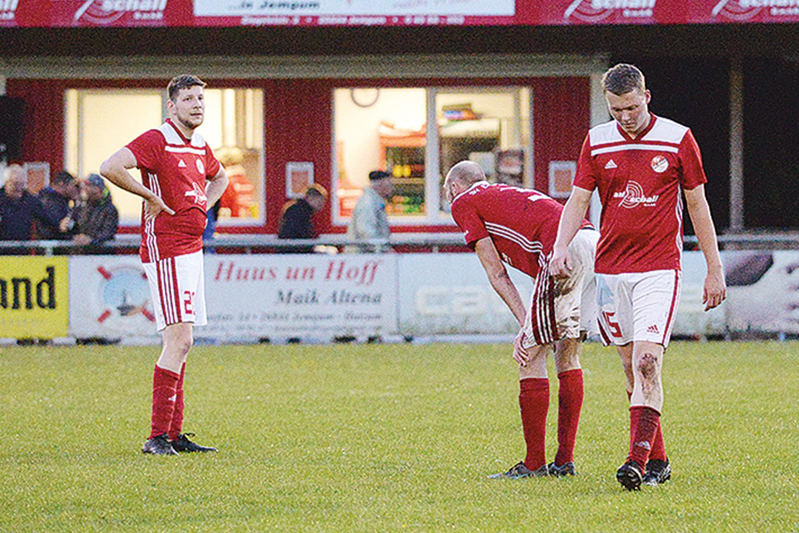 Geknickte Jemgumer nach Abpfiff: Hauke Buß (von links), Rikus Janssen, Lars Hommers und ihre Mitspieler konnten die Niederlage gegen den TuS Weene nicht abwenden.  © Foto: Born