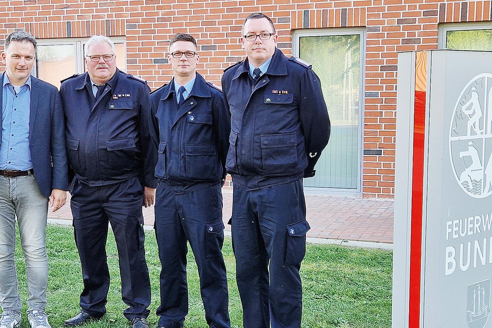 Hans-Herrmann Leemhuis und Dennis Iwanoff wurden kürzlich offiziell für eine weitere Amtszeit als Ortsbrandmeister (Leemhuis) und zum stellvertretenden Ortsbrandmeister ernannt. Wie die Gemeinde Bunde mitteilt, wurde dabei auch Ingfried Battermann zum Ehrengemeindebrandmeister ernannt. Das Foto zeigt ...