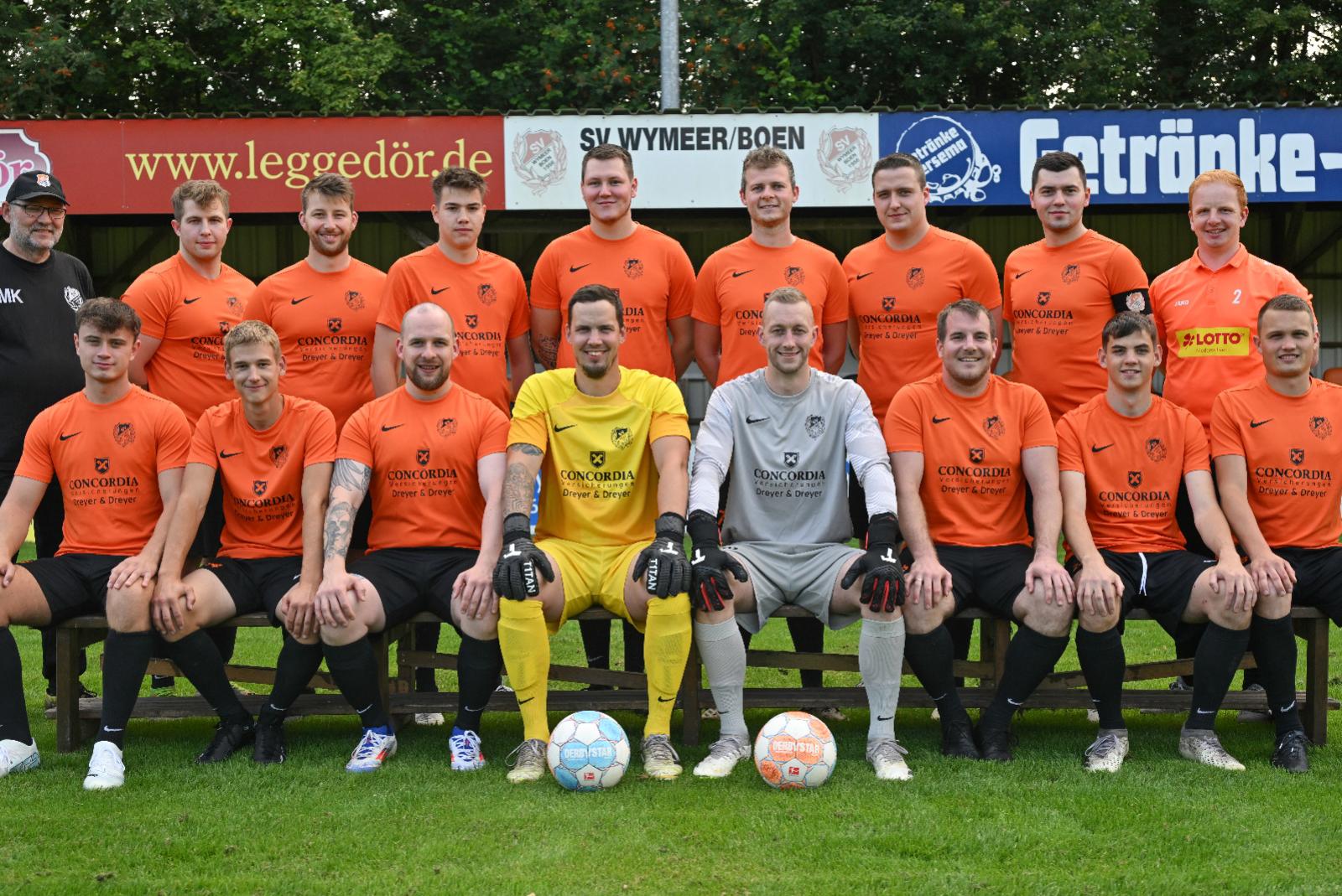 Die 1. Herren des SV Wymeer-Boen in der Saison 24/25. Obere Reihe von links: Trainer Manfred Klock, Nico Kronberg, Frank Schulte, Hauke Kettler. Florian Klock, Marco Dreesmann, Timo Blaauw, Dennis Klock und Betreuer Frank Lüppens. Untere Reihe von links: Dario Huisinga, Petrick Cöller, Jan Bakker, Ingo Lüppens, Michael Yzer, Henning Dreyer, Maximiliaan van Oostenrijk und Marvin Maas. Es fehlen: Elias Smid, Steffen Tergast, Ihno Frieling, Dieter Schulte und Benjamin Kock. © Bruins