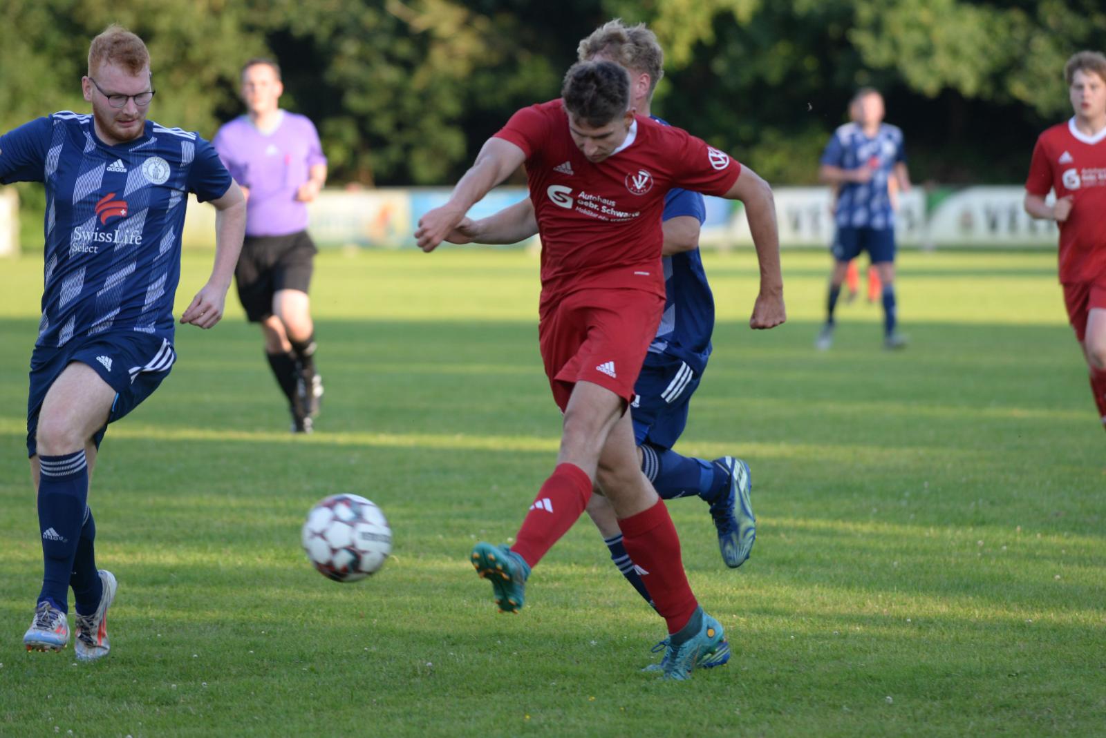Jannik Boekhoff (vorne, rotes Trikot) erzielte das 1:0 für Bunde II gegen die Sportfreunde Möhlenwarf und legte somit den Grundstein für den Sieg seines Teams. © Born