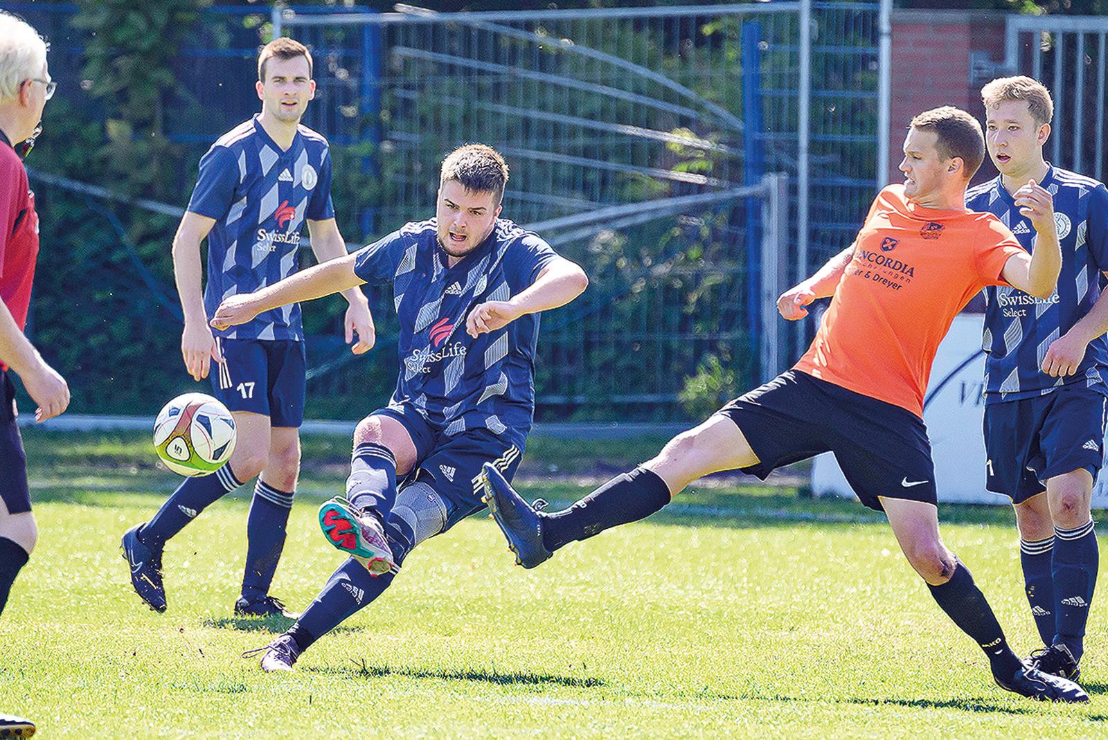 Domenik Bosma (in Schusshaltung) und Möhlenwarf boten Wymeer-Boen um Marvin Maas einen guten Kampf. © Foto: Bruins
