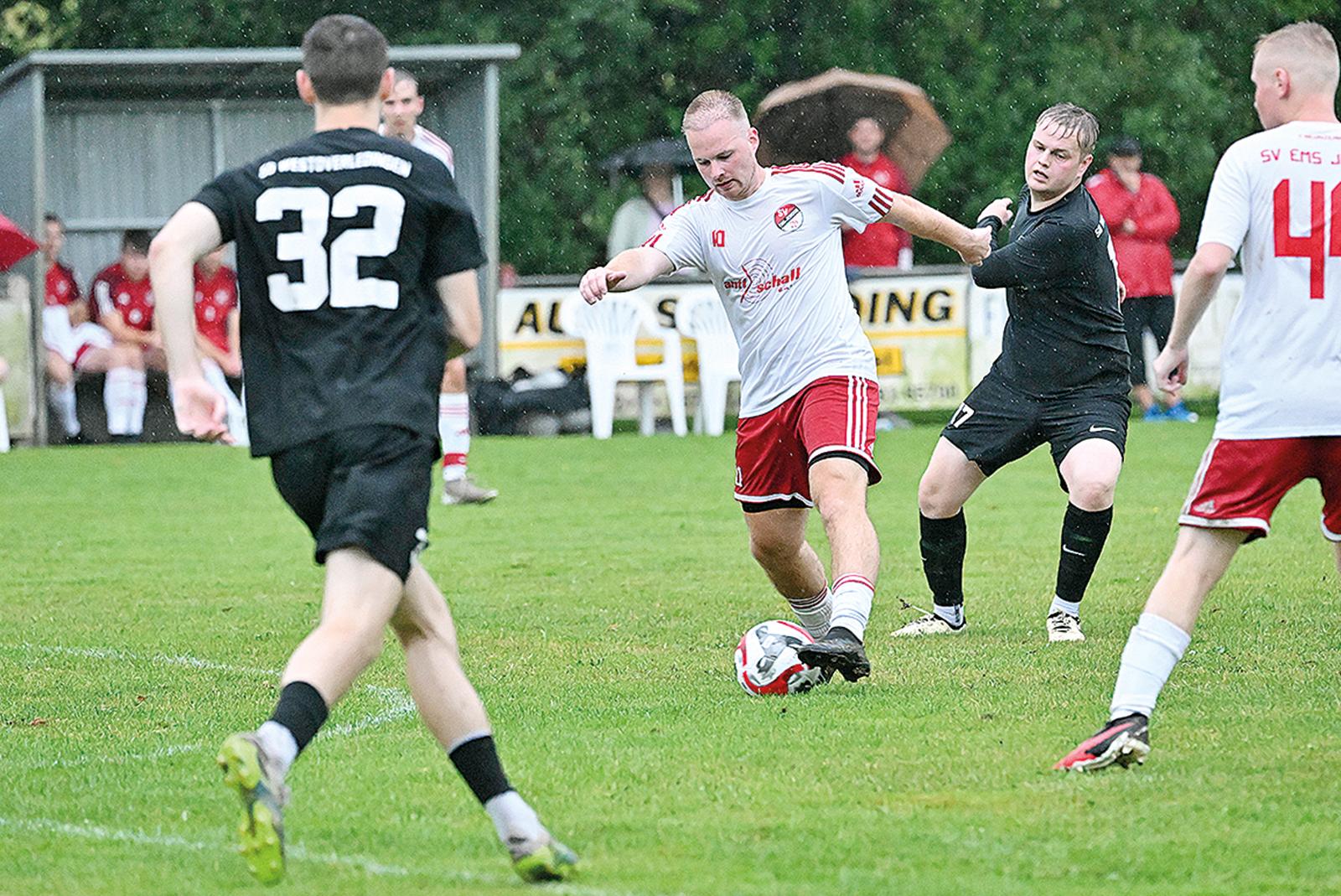 Marco Roelfs (am Ball) und die SG Ems/Dollart fanden erst in der zweiten Halbzeit so richtig in die Partie. Dann aber schossen sie sich deutlich ins Achtelfinale des Sparkassen-Pokals. © Foto: Bruins