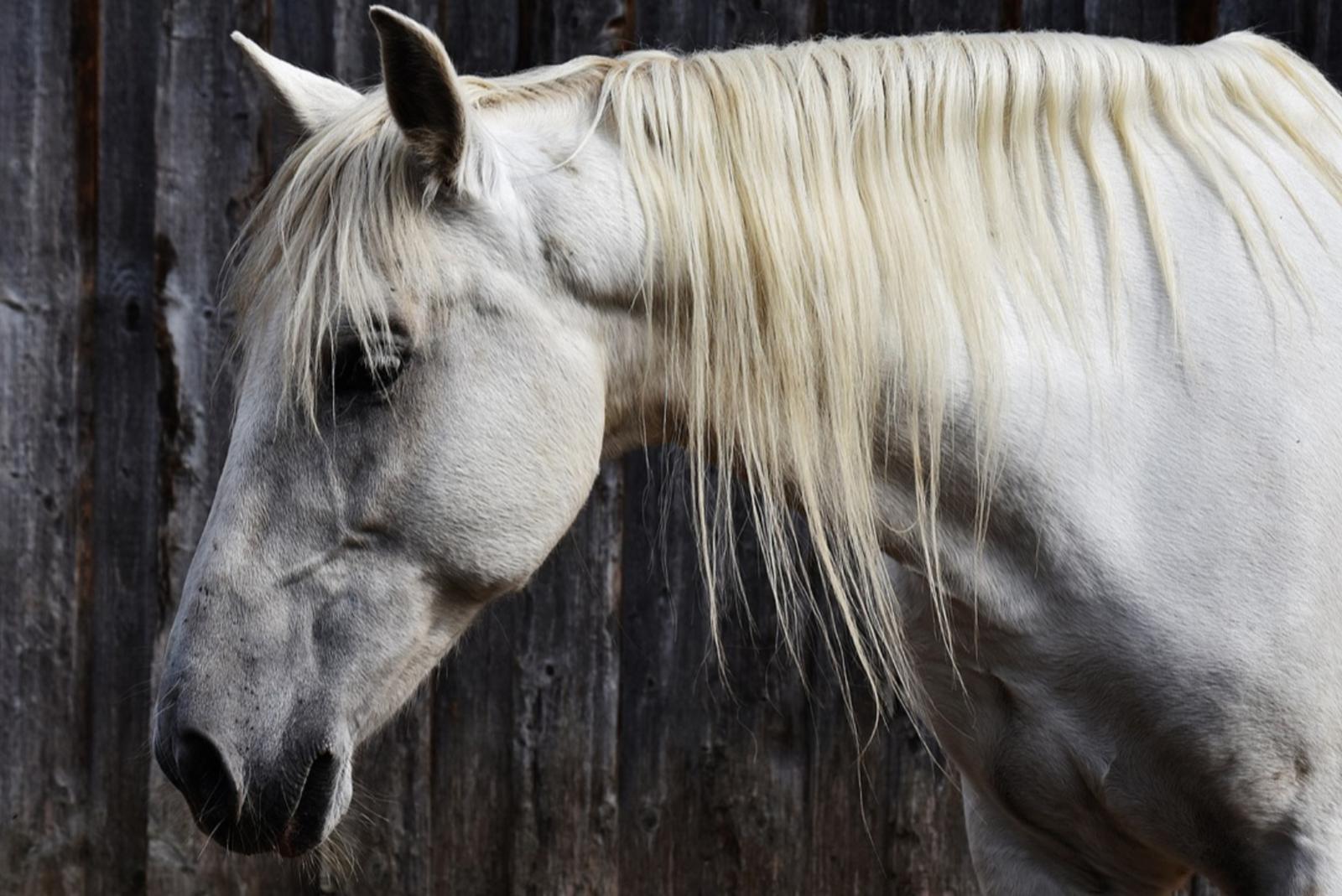 Weißes Pferd läuft auf der Straße herum