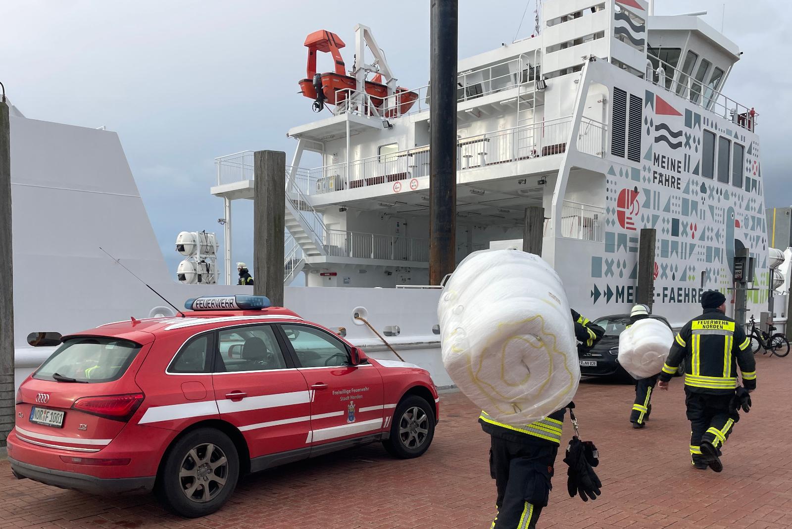 © Feuerwehr NordenDa das Öl auch ins Hafenbecken floss, forderte die Schiffsbesatzung die Freiwillige Feuerwehr Norden an, um eine Ölsperre um das Schiff zu legen. Die Einsatzkräfte befestigten saugfähige Ölsperren zwischen den Fährenden und der Kaimauer. Diese sollen das Öl aufnehmen. Die Schiffsbesatzung wird sich um die spätere Entsorgung selbst kümmern. Neben der Feuerwehr waren auch Vertreter der Hafenbehörde, der Wasserschutzpolizei sowie des Niedersächsischen Landesbetriebes für Wasserwirtschaft und Küsten- und Naturschutz vor Ort.