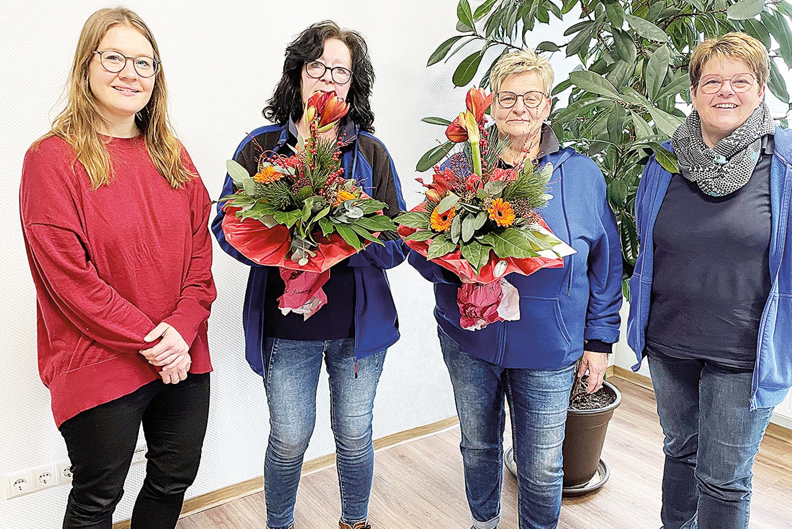 Zwei Mitarbeiterinnen der Diakoniestation Bunde-Jemgum feierten kürzlich ihr 25-jähriges Dienstjubiläum. Dafür wurden sie von Carina Gouterney, die ab dem 1. Januar die Geschäftsführung der Diakoniestation übernimmt, und Pflegedienstleiterin Hilde Hommer geehrt. Das Foto zeigt von ...