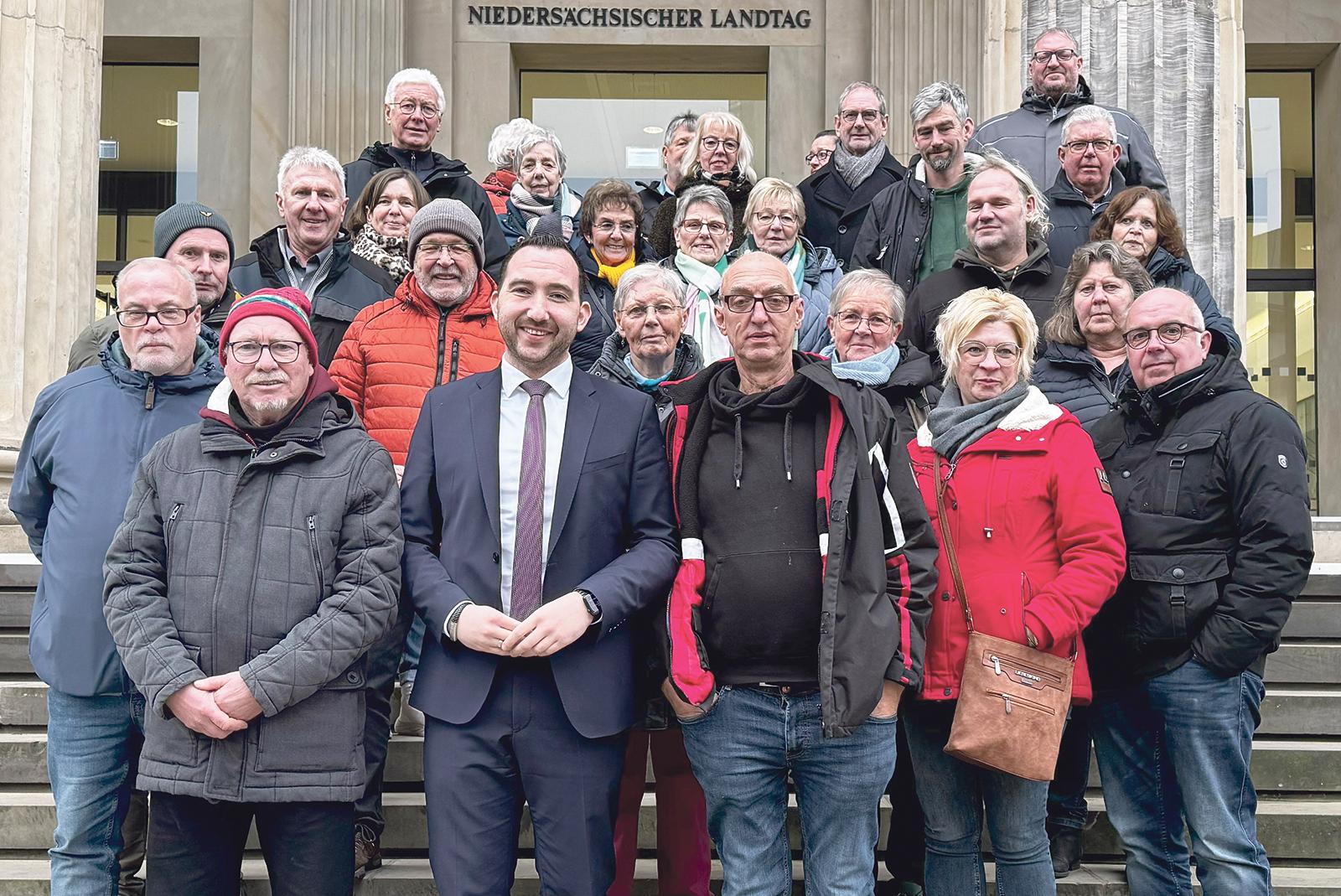 Der SPD-Landtagsabgeordnete Nico Bloem aus Tichelwarf (Zweiter von links vorne) begrüßte jetzt mehr als 30 Männer und Frauen aus dem Kreis Leer, die seine Einladung zu einer Besucherfahrt zum Landtag nach Hannover angenommen hatten. Nach einem ...