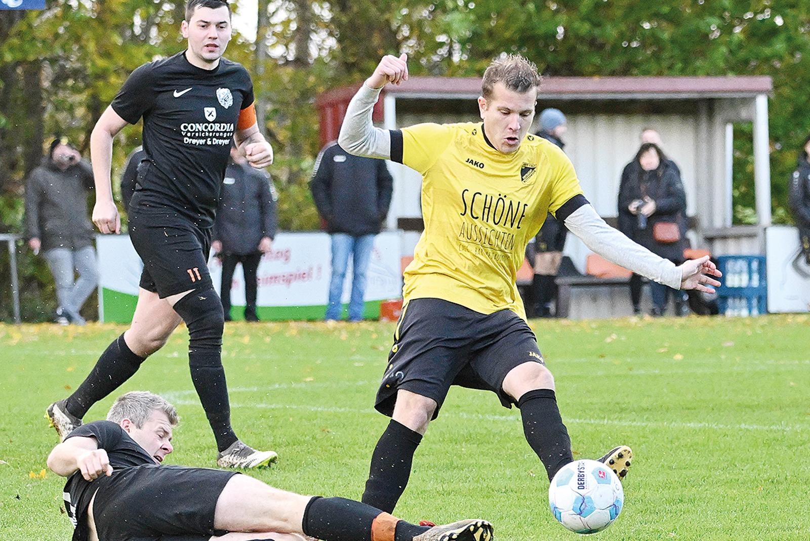 Sollen offensiv für mehr Schwung sorgen: Wymeer-Boens Marco Dreesmann (liegend) und Kapitän Dennis Klock (im schwarzen Trikot hinten). Gegen Nüttermoor (gelbe Trikots) reichten Klocks Tore nur für einen Punkt. © Foto: Bruins