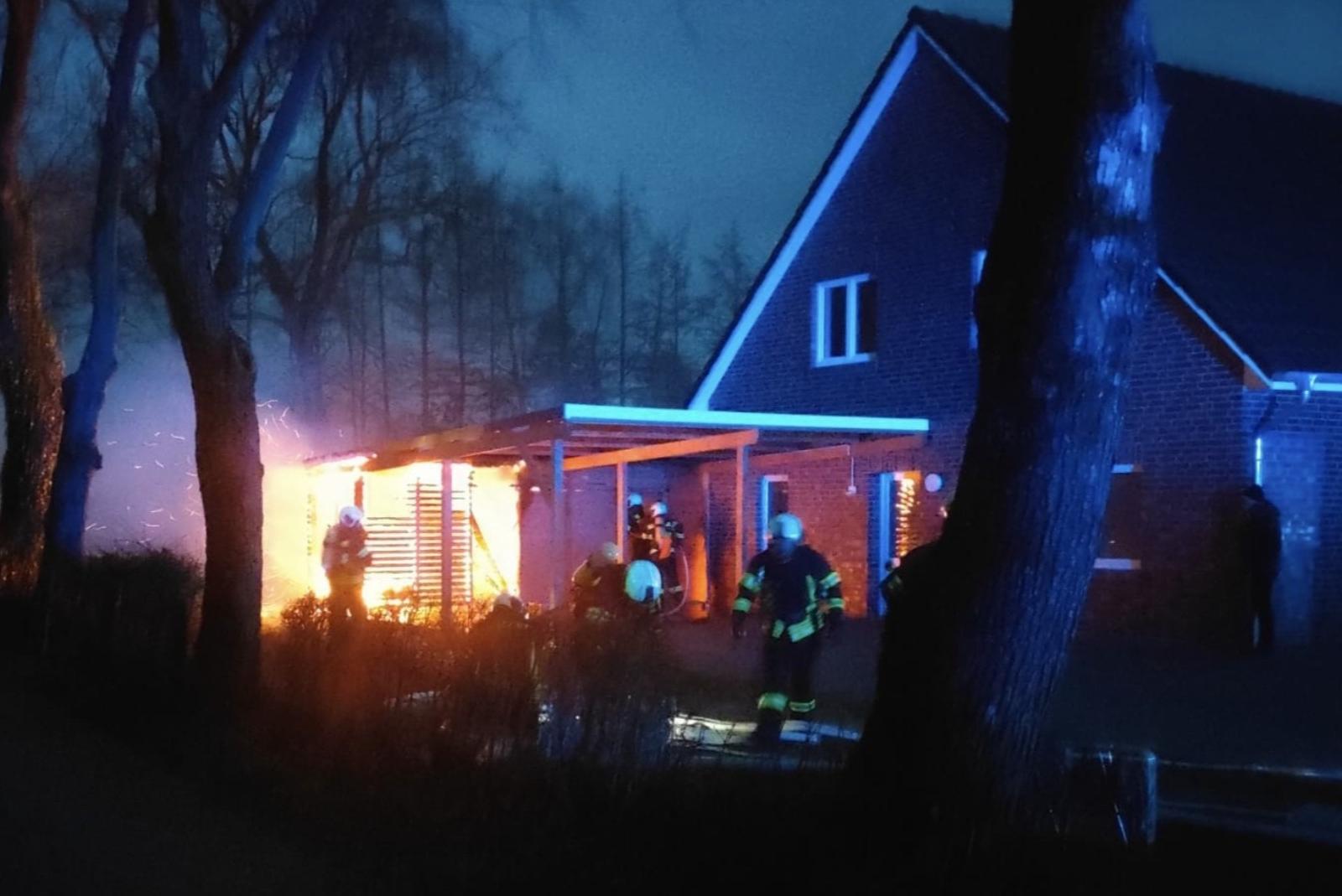 Nur durch schnelles Eingreifen haben Einsatzkräfte der Feuerwehren Plaggenburg und Middels am Freitagabend das Übergreifen eines Carportbrandes auf ein Wohngebäude verhindert. Um 17.53 Uhr waren die Feuerwehrleute in die Pfalzdorfer Straße in Aurich-PFalzdorf alarmiert worden, beim Eintreffen stand der rückwärtige Teil des direkt an ein Doppelhaus grenzenden Unterstands bereits in Vollbrand. Die Bewohner hatten sich nach Angaben der Feuerwehr rechtzeitig und unbeschadet in Sicherheit bringen können. Atemschutzgeräteträger gingen umgehend mit zwei Strahlrohren gegen die Flammen vor.