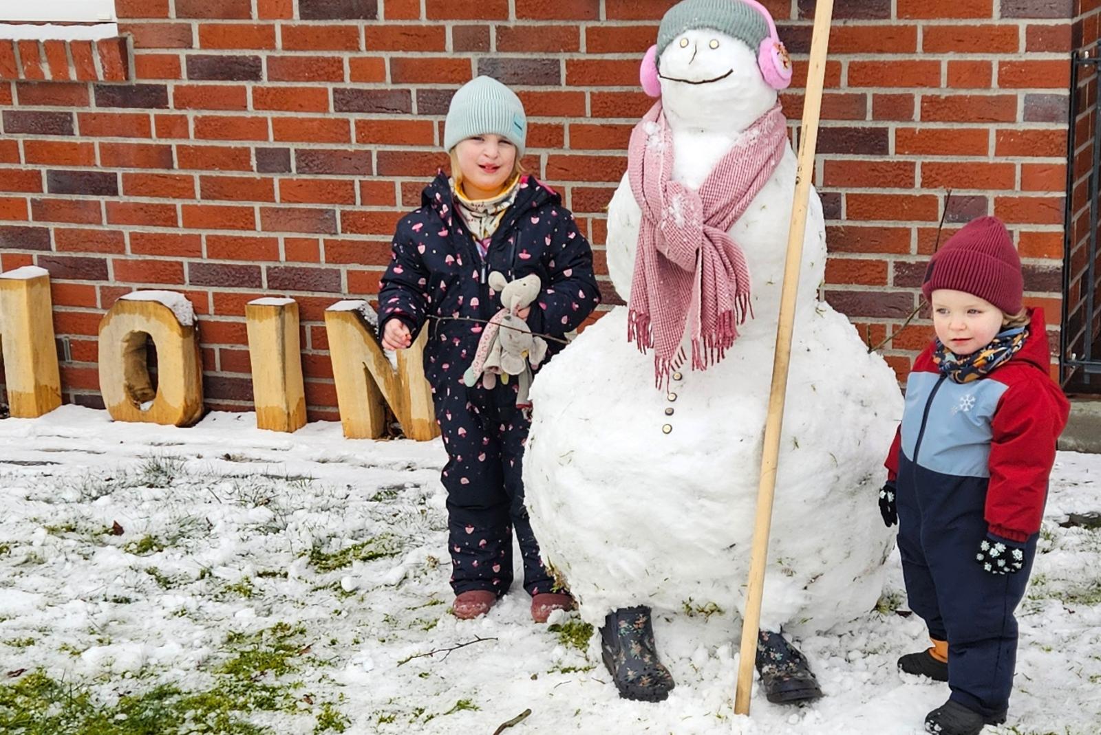 Joel, er ist acht Jahre alt, der fünfjährige Leon und die zweijährige Fabienne haben zusammen einen Schneemann gebaut im Garten von Oma und Opa in Weener.