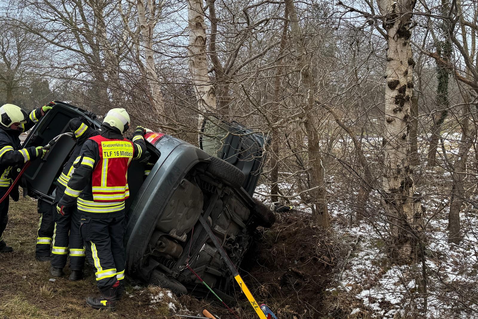 Feuerwehr schneidet Verletzten mit Rettungsgerät aus dem Fahrzeugwrack