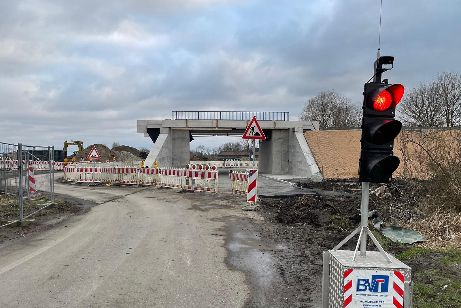 Die Hilkenborger Straße im Bereich der Großbaustelle der Friesenbrücke soll jetzt vorerst wieder freigegeben werden, auch wenn die Bauarbeiten noch nicht beendet sind. Bis Freitag war die Straße gesperrt wegen Arbeiten an der neuen Eisenbahnbrücke, ...