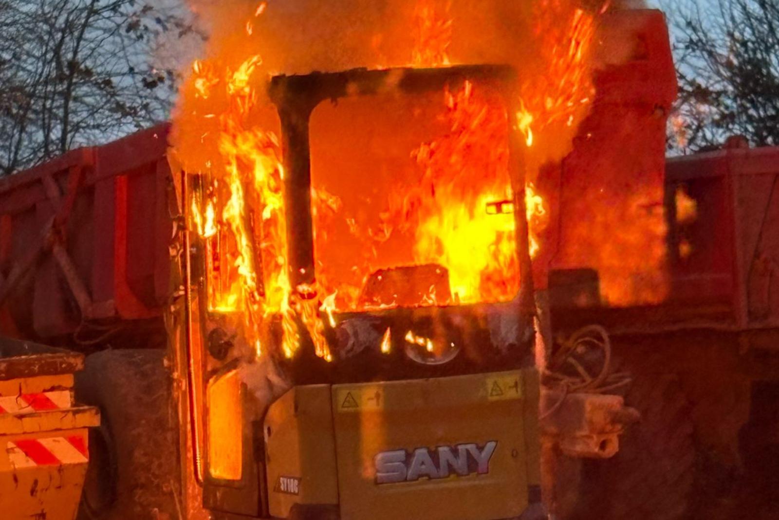 Als die Einsatzkräfte der Feuerwehr vor Ort eintrafen, stand der Minibagger in Vollbrand. Ein Trupp unter Atemschutz konnte den Brand zügig löschen.