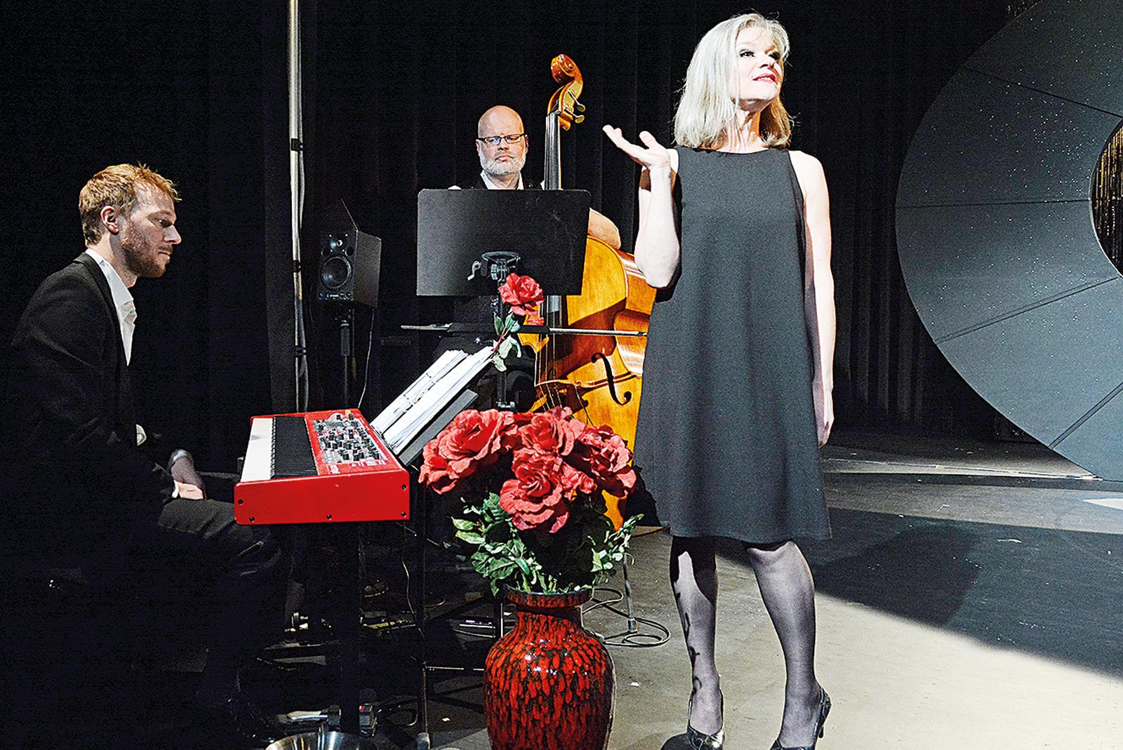 Ramona Marx als Hilde, im schwarzen Kleid und ...