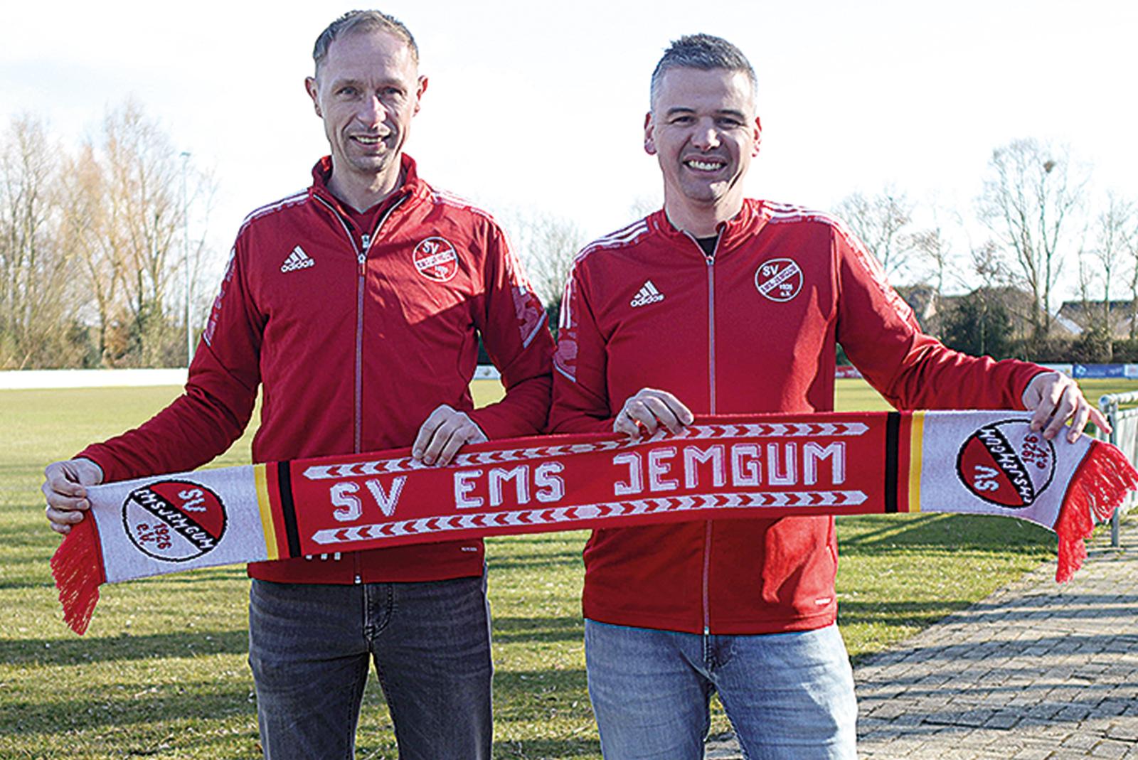 Wunschlösung: Johann Lübbers (links) war die erste Wahl von Jemgums Fußballobmann Christoph Behrends. Nun wurde der Ex-Möhlenwarf-Coach als neuer Trainer vorgestellt.  © Foto: Born