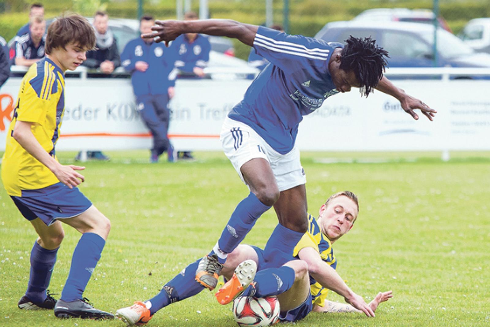 Kaum zu stoppen war Collinghorst/Rajens Djeman Diabate. Hier kommt er allerdings nicht an Michael Yzer vorbei. © Foto: Mentrup