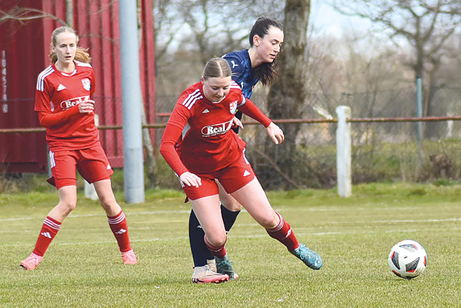 Glücklos agierte der SV TiMoNo (rote Trikots) in der Offensive. Vor allem die Rheiderländerin Lea Siemens (Bildmitte) vergab gute Chancen. © Foto: Koppelkamm