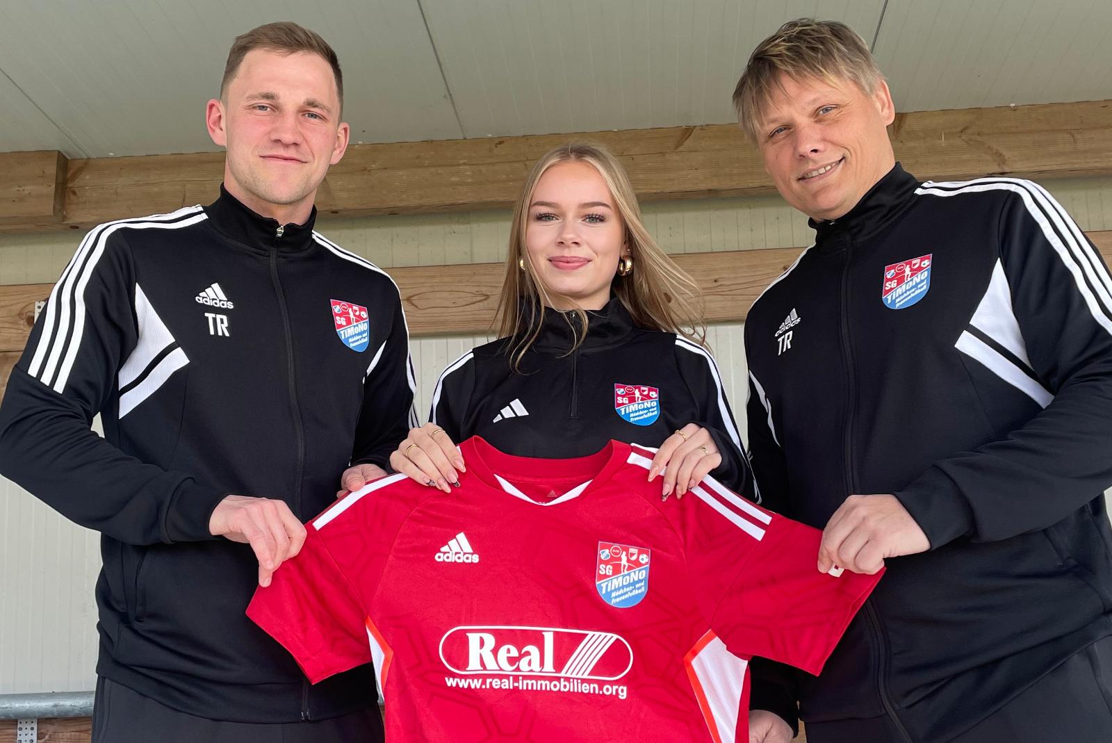 Trainer Jan-Henrik Koppelkamm (links) und Co-Trainer Otmar Jetses stellen Teresa Sonntag als Zugang des SV TiMoNo vor. © privat