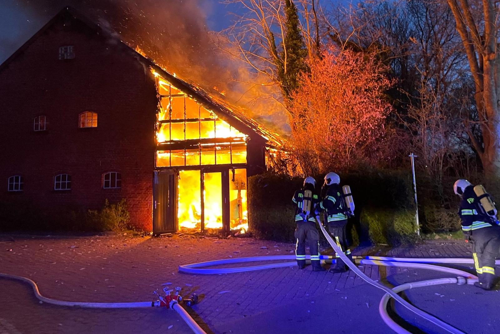 Auf dem Gelände einer Seniorenwohnanlage in der Bürgermeister-Friesenborg-Straße in Aurich stand am Freitagmorgen ein größeres Nebengebäude in Flammen. Das Feuer hatte sich bei Ankunft der ersten Einsatzkräfte bereits auf den kompletten Bau ausgebreitet. Für die anrückenden Einheiten der Feuerwehren Haxtum und Aurich galt es somit, eine sofortige Riegelstellung zur benachbarten Residenz zu errichten, in der sich zu diesem Zeitpunkt über 100 Bewohner aufhielten. Zugleich wurde die Brandbekämpfung durch mehrere Atemschutztrupps und den Dachwerfer eines Tanklöschfahrzeuges eingeleitet. Herausfordernd erwiesen sich zudem die engen Platzverhältnisse in der Straße, die von Beginn an eine koordinierte Aufstellung der Löschfahrzeuge vonnöten machten, teilt die Auricher Feuerwehr mit.