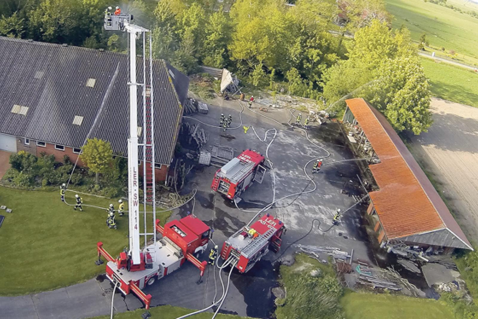 Sechs Ortsfeuerwehren waren am Freitagabend bei einer Großübung in Weenermoor im Einsatz. Das Szenario: ein Bauernhof stand in Flammen. Zusätzlich wurde ein Verkehrsunfall simuliert. An der Übung nahmen insgesamt neun Feuerwehrfahrzeuge und mehr als 100 Einsatzkräfte teil.