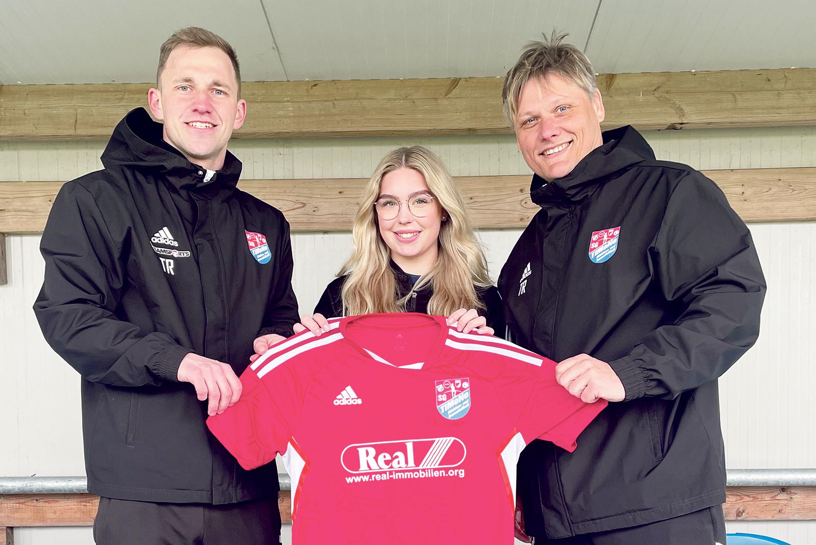 Trainer Jan-Henrik Koppelkamm (links) und Co-Trainer Otmar Jetses stellen Pia Hainz vom TuS Büppel vor.  © Foto: privat