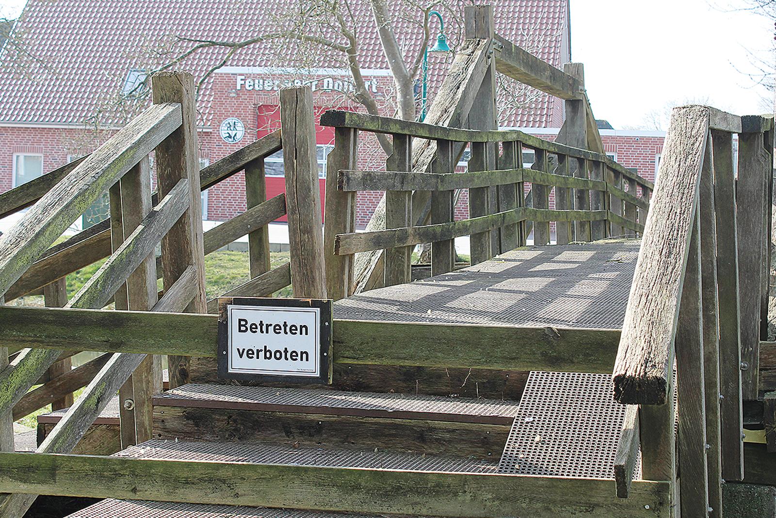 Die hölzerne Fußgängerbrücke über das Sieltief zwischen dem Feuerwehrhaus und dem Freizeitgelände in Ditzumerverlaat ist abgängig und daher seit mehr als einem Jahr gesperrt. Nun rü...