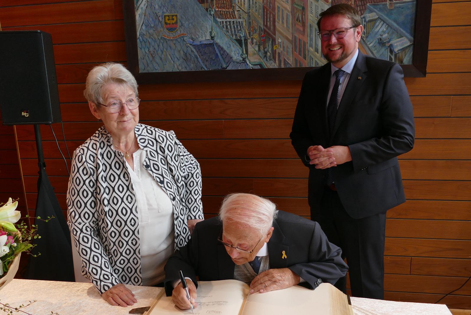 Holocaust-Überlebender Albrecht Weinberg und Gerda Dänekas tragen sich ins Goldene Buch der Stadt Emden ein