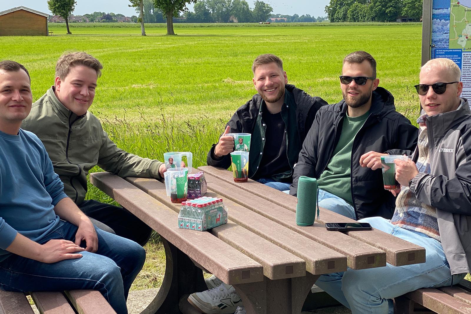 Gut gelaunt und inmitten des frühlingsgrünen und sonnigen Heinitzpolders machten (von links) Lars van Wieren, Dirk Ridder, Hauke Buß, Hannes Wilken und Markus Geuken am »Vatertag« ihre erste Pause in Aaltuikerei, quasi am Anfang der Radtour. Ziel der ...