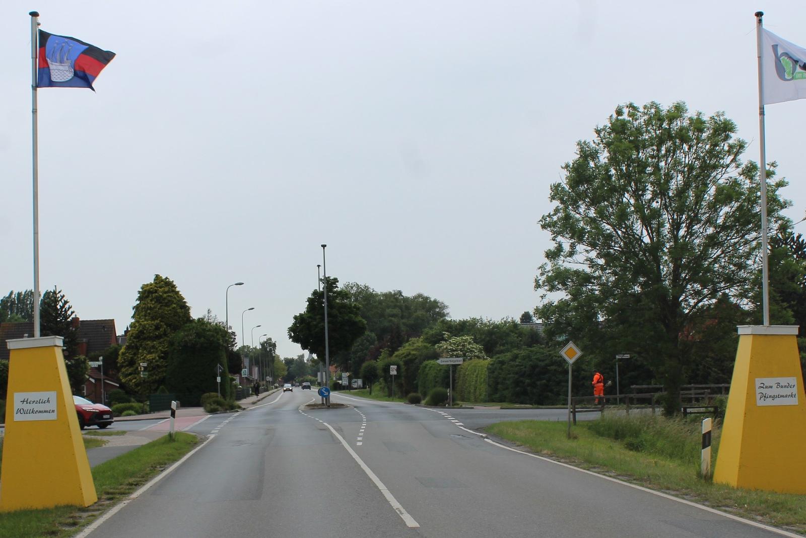 Am Bunder Ortseingang heißen seit der vergangenen Woche Flaggen Autofahrer willkommen und laden zum Pfingstmarkt ein. In der vergangenen Nacht wurden die Flaggen durch zwei Reichsfahnen ausgetauscht. Die Polizei hat diese sichergestellt und die Ermittlungen aufgenommen.