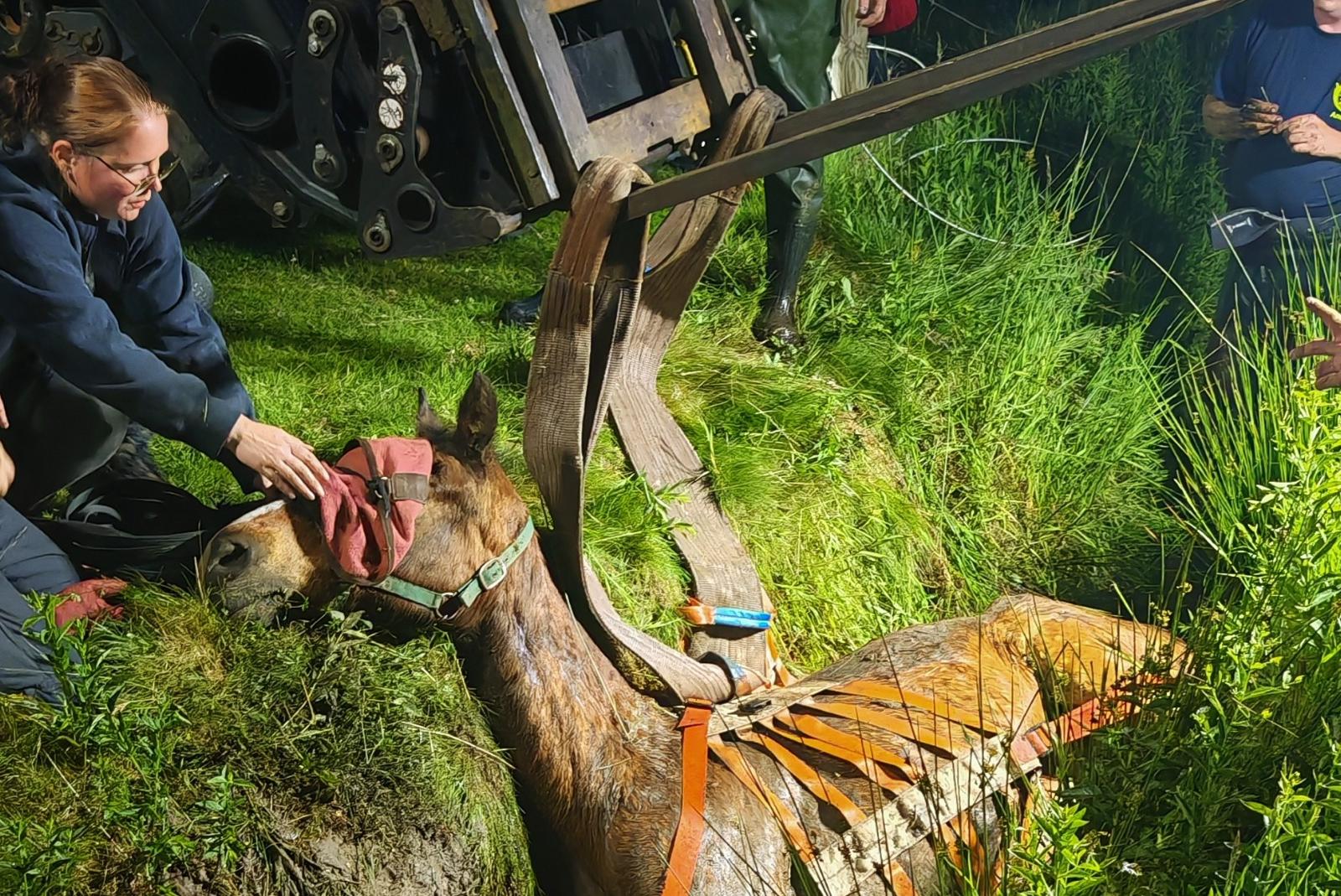 Zur Unterstützung war eine Tierärztin vor Ort, die das Tier sedierte. Dadurch konnte das Pferd stressfrei aus seiner misslichen Lage befreit werden, und auch für die eingesetzten Kräfte wurde die Rettungsaktion erheblich sicherer.
