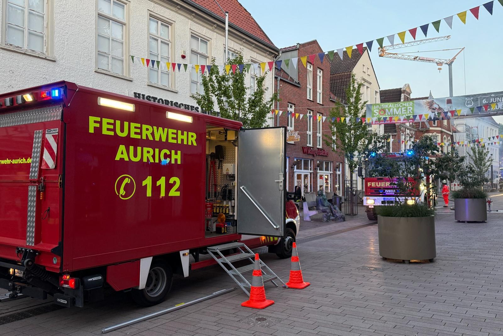 Die enormen Flammen sowie daraus resultierender Funkenflug hätten die beiden nebenstehenden Gebäudekomplexe massivst gefährdet, sodass umgehend die Alarmstufe erhöht worden sei. Neben der bereits anrückenden Feuerwehr Aurich seien auch die Feuerwehren Haxtum und Walle in den Stadtkern gerufen worden.