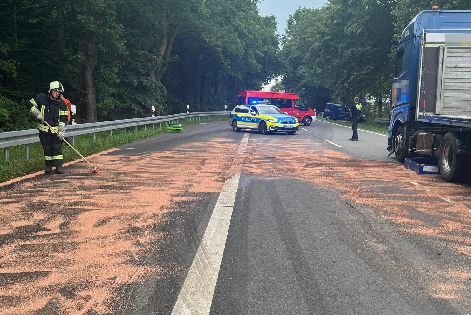 Der nicht mehr fahrtüchtige Lastwagen ist anschließend abgeschleppt worden, die Reinigung der Fahrbahn wurde durch eine Fachfirma durchgeführt. Rund zwei Stunden waren etwa 35 Einsatzkräfte sowie die Kreisstraßenmeisterei und die Untere Wasserbehörde vor Ort gefordert.