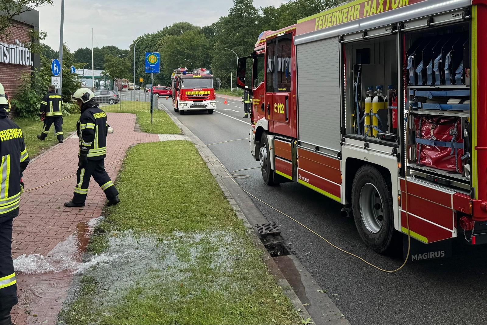© FeuerwehrDurch eine Außentür trat das Wasser nach einiger Zeit dann auch in die Räume des Marktes ein, weshalb die Feuerwehr Haxtum zur Hilfe gerufen wurde. Wenig später anrückende Einsatzkräfte setzten eine Tauchpumpe ein, um den angesammelten Niederschlag aus der Senke heraus zu befördern und ein weiteres Eindringen das Wasser in den Supermarkt zu verhindern. Das bereits hineingeflossene Wasser wurde von den Mitarbeitern entfernt, sodass der Betrieb ungestört weiterlaufen konnte. Gut eine halbe Stunde pumpten die Feuerwehrleute das Regenwasser so weit wie möglich aus der Senke ab, bis keine weitere Gefahr mehr bestand.